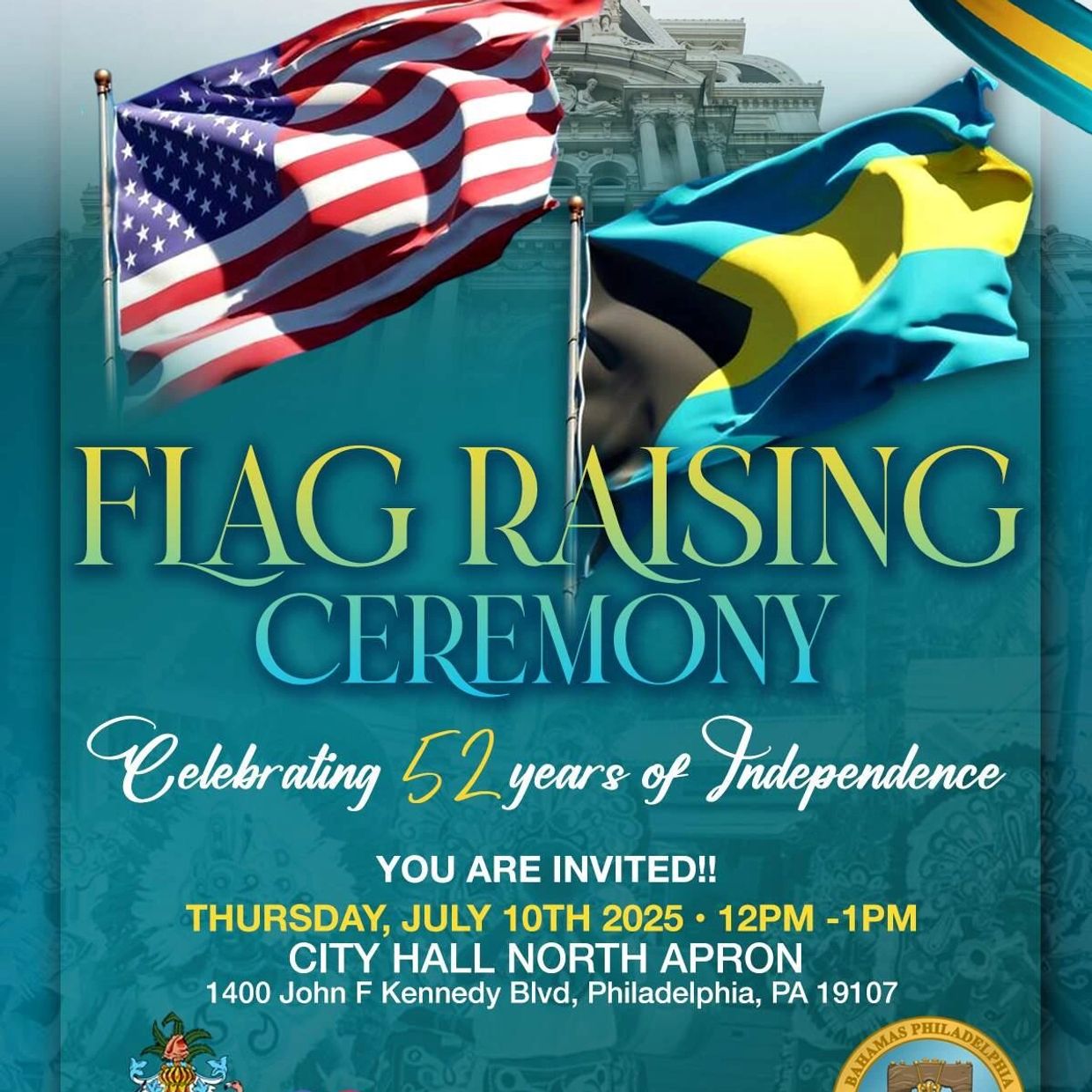 Thursday, July 10th at 12 pm, City Hall will be raising the Bahamian Flag in honor of our Independence Day. Come dressed in your best Bahamian Pride!