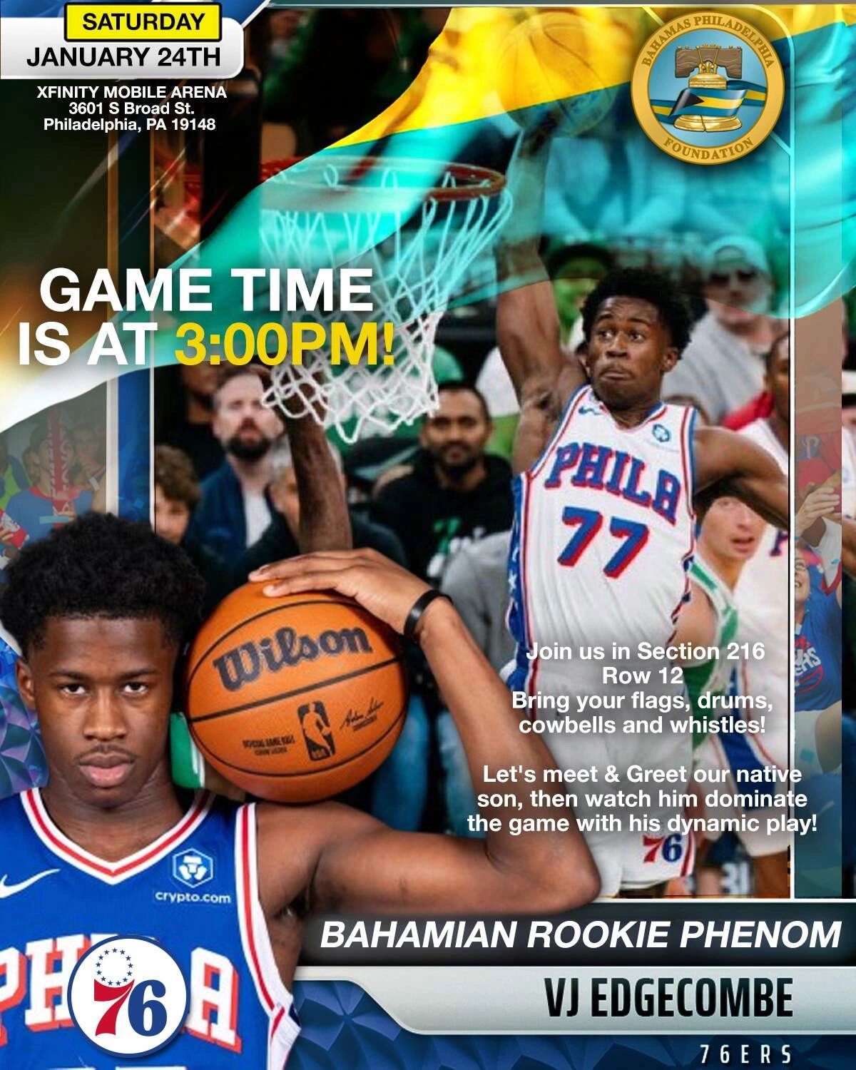 Join us at 3 PM to cheer on our fellow Bahamian on the 76ers, VJ Edgecombe! Section 216, Row 12.